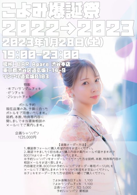 【こよみ爆誕祭2022→2023】 1/28(土)19:00-23:00@渋谷Apare 当日参加希望、遠隔注文希望どちらも下記専用フォームよりお申し込みをお願いいたします。 mailform.mface.jp/frms/kyts2/t9l… 当日参加抽選〆切12/26 遠隔注文〆切1/26 最終回感がすごい❤️🔥まだやること考え中ですが当日楽しみにしててください❤️🔥