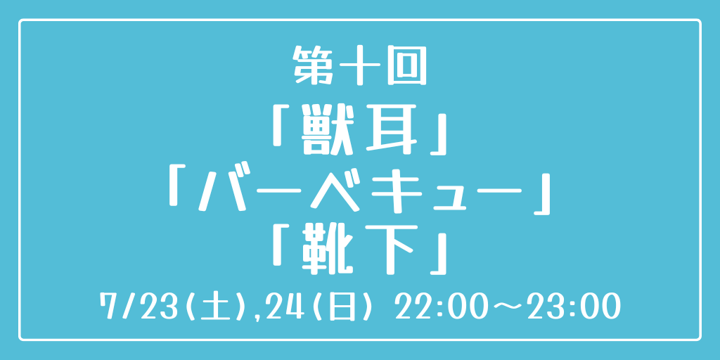 [第十回] 開催日時:7月23日(土)、24日(日) 22:00~23:00 お題:「獣耳」「バーベキュー」「靴下」 3つのお題全てを使用していただいても、1つ・2つのみの使用でも結構です。 完成後 #重行ワンドロワンライ のタグを付けて投稿してください。 詳細なルールはツイフィールをご覧ください。