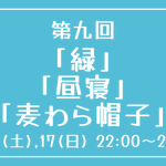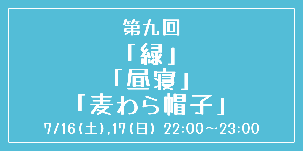 [第九回] 開催日時:7月16日(土)、17日(日) 22:00~23:00 お題:「緑」「昼寝」「麦わら帽子」 3つのお題全てを使用していただいても、1つ・2つのみの使用でも結構です。 完成後 #重行ワンドロワンライ のタグを付けて投稿してください。 詳細なルールはツイフィールをご覧ください。