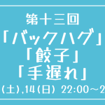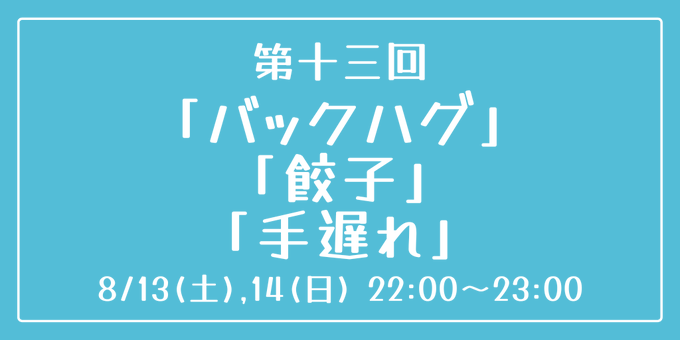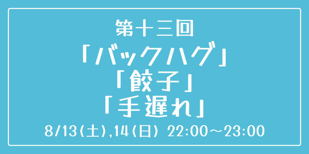 [第十三回] 開催日時:8月13日(土)、14日(日) 22:00~23:00 お題:「バックハグ」「餃子」「手遅れ」 3つのお題全てを使用していただいても、1つ・2つのみの使用でも結構です。 完成後 #重行ワンドロワンライ のタグを付けて投稿してください。 詳細なルールはツイフィールをご覧ください。
