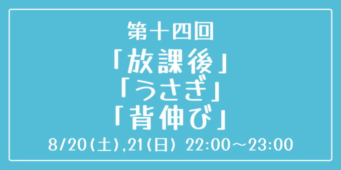 [第十四回] 開催日時:8月20日(土)、21日(日) 22:00~23:00 お題:「放課後」「うさぎ」「背伸び」 3つのお題全てを使用していただいても、1つ・2つのみの使用でも結構です。 完成後 #重行ワンドロワンライ のタグを付けて投稿してください。 詳細なルールはツイフィールをご覧ください。
