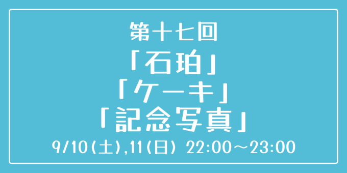 [第十七回] 開催日時:9月10日(土)、11日(日) 22:00~23:00 お題:「石珀」「ケーキ」「記念写真」 3つのお題全てを使用していただいても、1つ・2つのみの使用でも結構です。 完成後 #重行ワンドロワンライ のタグを付けて投稿してください。 詳細なルールはツイフィールをご覧ください。