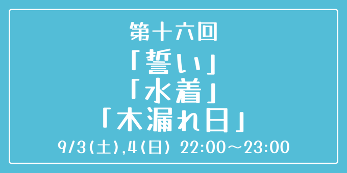[第十六回] 開催日時:9月3日(土)、4日(日) 22:00~23:00 お題:「誓い」「水着」「木漏れ日」 3つのお題全てを使用していただいても、1つ・2つのみの使用でも結構です。 完成後 #重行ワンドロワンライ のタグを付けて投稿してください。 詳細なルールはツイフィールをご覧ください。