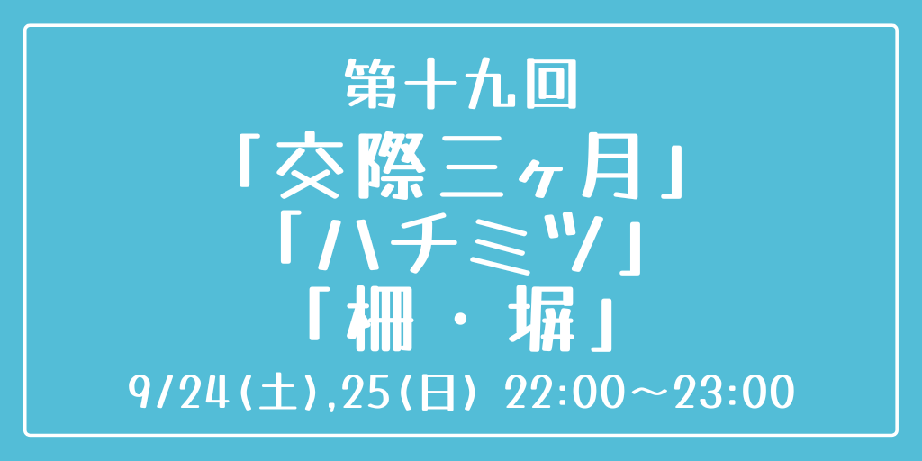 [第十九回] 開催日時:9月24日(土)、25日(日) 22:00~23:00 お題:「交際三ヶ月」「ハチミツ」「柵・塀」 3つのお題全てを使用していただいても、1つ・2つのみの使用でも結構です。 完成後 #重行ワンドロワンライ のタグを付けて投稿してください。 詳細なルールはツイフィールをご覧ください。