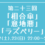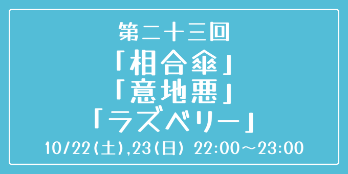 [第二十三回] 開催日時:10月22日(土)、23日(日) 22:00~23:00 お題:「相合傘」「意地悪」「ラズベリー」 3つのお題全てを使用していただいても、1つ・2つのみの使用でも結構です。 完成後 #重行ワンドロワンライ のタグを付けて投稿してください。 詳細なルールはツイフィールをご覧ください。