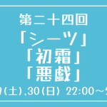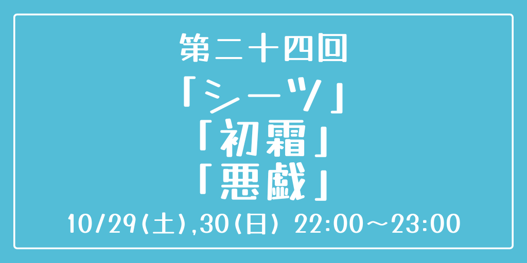 [第二十四回] 開催日時:10月29日(土)、30日(日) 22:00~23:00 お題:「シーツ」「初霜」「悪戯」 3つのお題全てを使用していただいても、1つ・2つのみの使用でも結構です。 完成後 #重行ワンドロワンライ のタグを付けて投稿してください。 詳細なルールはツイフィールをご覧ください。