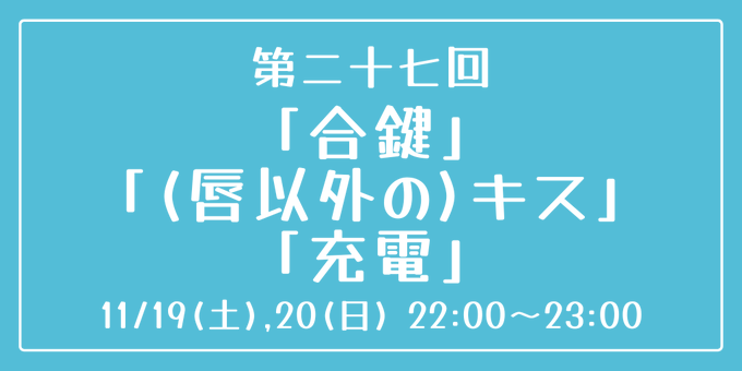 [第二十七回] 開催日時:11月19日(土)、20日(日) 22:00~23:00 お題:「合鍵」「(唇以外の)キス」「充電」 3つのお題全てを使用していただいても、1つ・2つのみの使用でも結構です。 完成後 #重行ワンドロワンライ のタグを付けて投稿してください。 詳細なルールはツイフィールをご覧ください。
