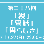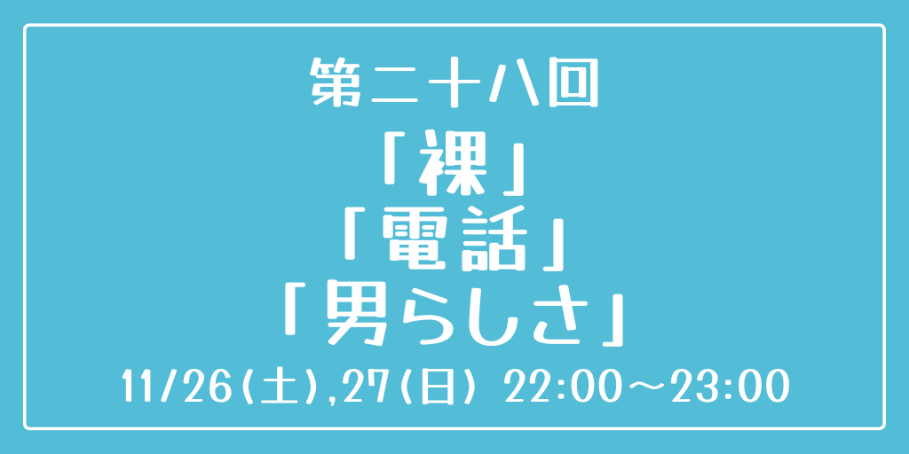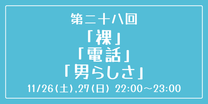 [第二十八回] 開催日時:11月26日(土)、27日(日) 22:00~23:00 お題:「裸」「電話」「男らしさ」 3つのお題全てを使用していただいても、1つ・2つのみの使用でも結構です。 完成後 #重行ワンドロワンライ のタグを付けて投稿してください。 詳細なルールはツイフィールをご覧ください。
