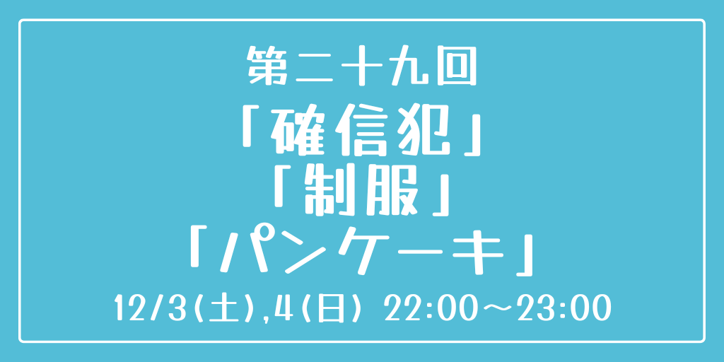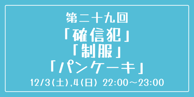 [第二十九回] 開催日時:12月3日(土)、4日(日) 22:00~23:00 お題:「確信犯」「制服」「パンケーキ」 3つのお題全てを使用していただいても、1つ・2つのみの使用でも結構です。 完成後 #重行ワンドロワンライ のタグを付けて投稿してください。 詳細なルールはツイフィールをご覧ください。