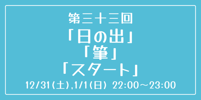 [第三十三回] 開催日時:12月31日(土)、2023年1月1日(日) 22:00~23:00 お題:「日の出」「筆」「スタート」 3つのお題全てを使用していただいても、1つ・2つのみの使用でも結構です。 完成後 #重行ワンドロワンライ のタグを付けて投稿してください。 詳細なルールはツイフィールをご覧ください。