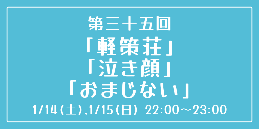 [第三十五回] 開催日時:1月14日(土)、15日(日) 22:00~23:00 お題:「軽策荘」「泣き顔」「おまじない」 3つのお題全てを使用していただいても、1つ・2つのみの使用でも結構です。 完成後 #重行ワンドロワンライ のタグを付けて投稿してください。 詳細なルールはツイフィールをご覧ください。