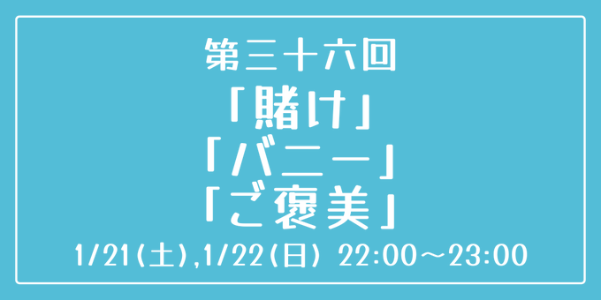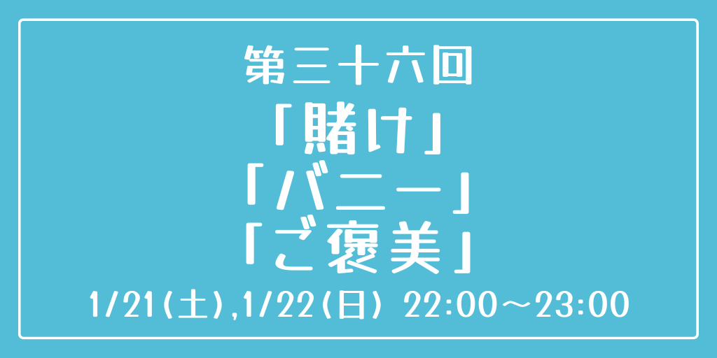 [第三十六回] 開催日時:1月21日(土)、22日(日) 22:00~23:00 お題:「賭け」「バニー」「ご褒美」 3つのお題全てを使用していただいても、1つ・2つのみの使用でも結構です。 完成後 #重行ワンドロワンライ のタグを付けて投稿してください。 詳細なルールはツイフィールをご覧ください。