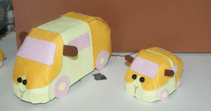 モルカー作り直しました 右側の小さい方が、かわいいですよね まだシャーシに乗せていませんが、シャーシはすぐ作れます、とりあえずボディーはコレでOKですね #手作りモルカー #モルカー作ってみた #モルカー #ペーパークラフト #フェルト