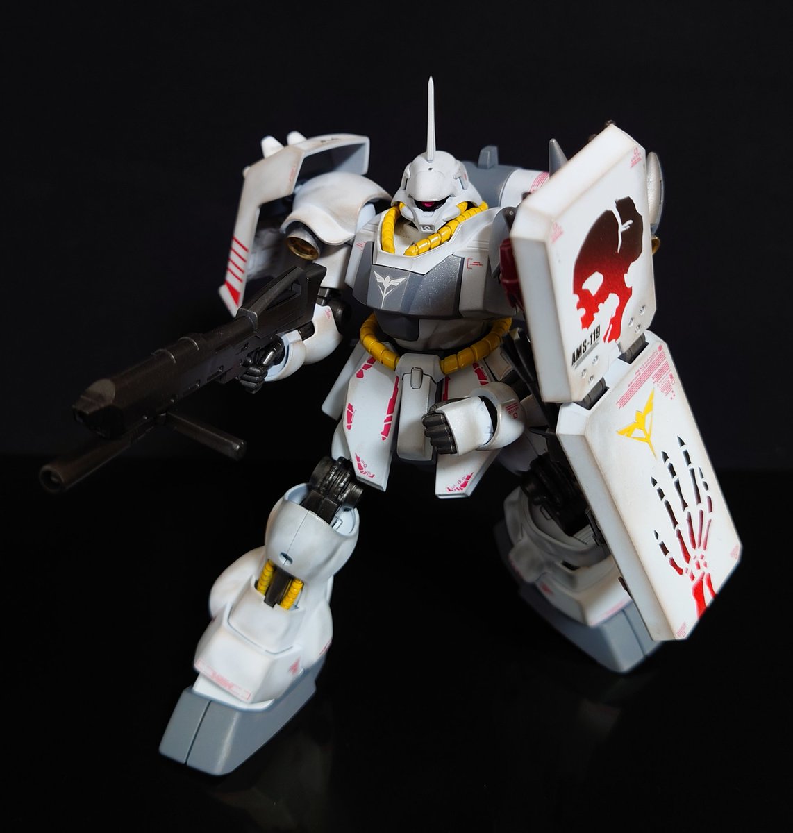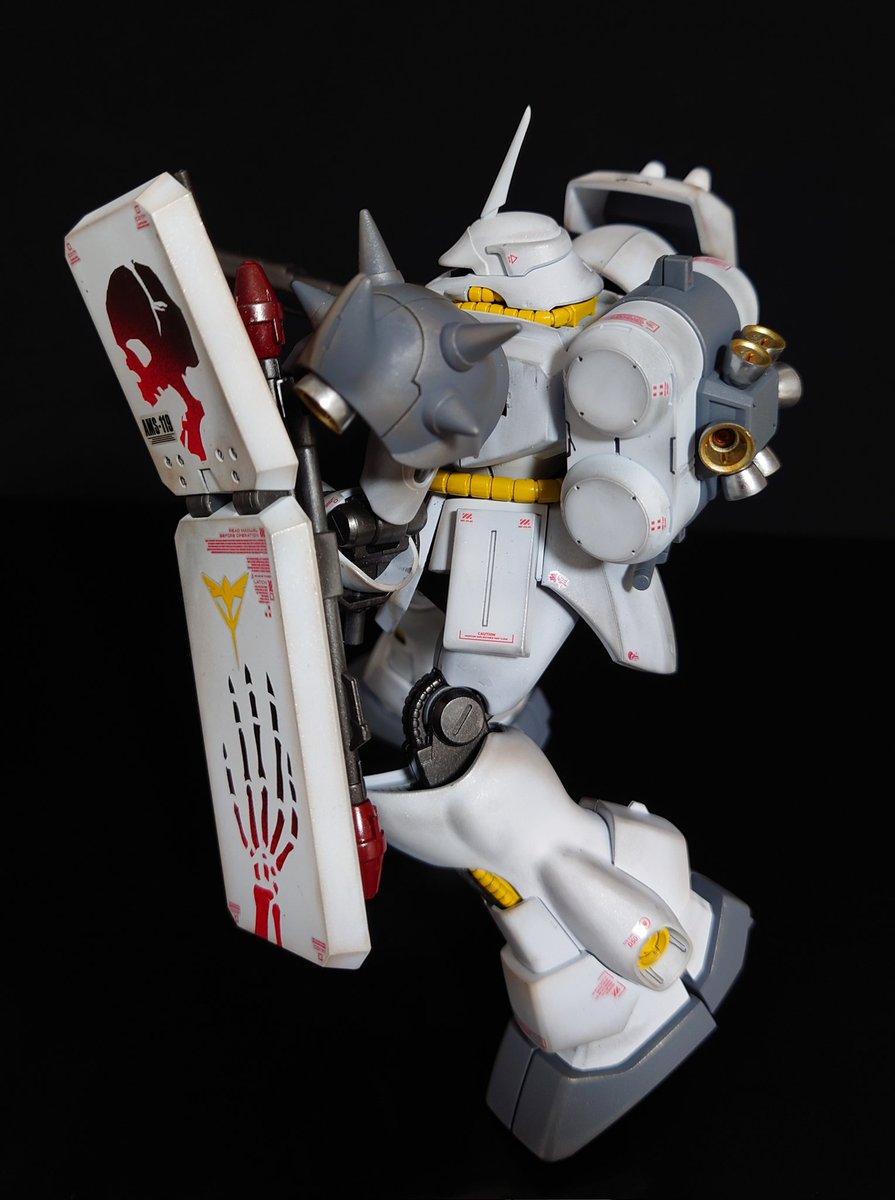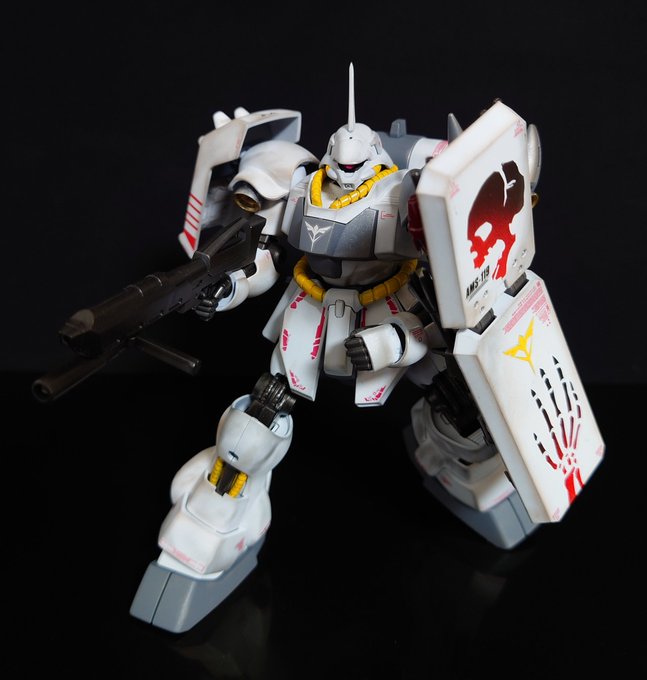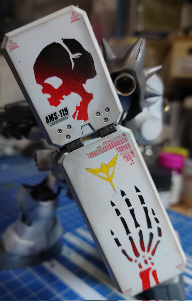 完成です! AMS-119 GEARA DOGA 自分には珍しく短期間での作成でしたが楽しめたキットでした。 今回はシールドに少しこだわりを✨ マスキングテープに骸骨のイラストを描いて切り抜きグラデーション塗装で仕上げました。 次へ #ガンプラ好きと繋がりたい #ガンプラの画像を貼るとRTされると聞いて