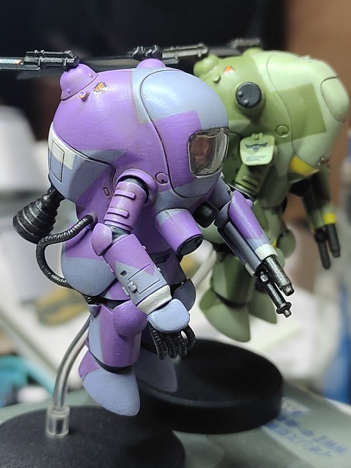 素組みで放置していたガチャーネンのカウツですが緑黄色社会の『ピンクブルー』を聴いて安直だけど「桃色と青で塗ったらよくね?」と思って実際に塗ってみました。シュトラール軍の兵器はカッコ可愛いのでポップな色が似合うと個人的には思っちょります。 #マシーネンクリーガー #リョクシャカpinkblue