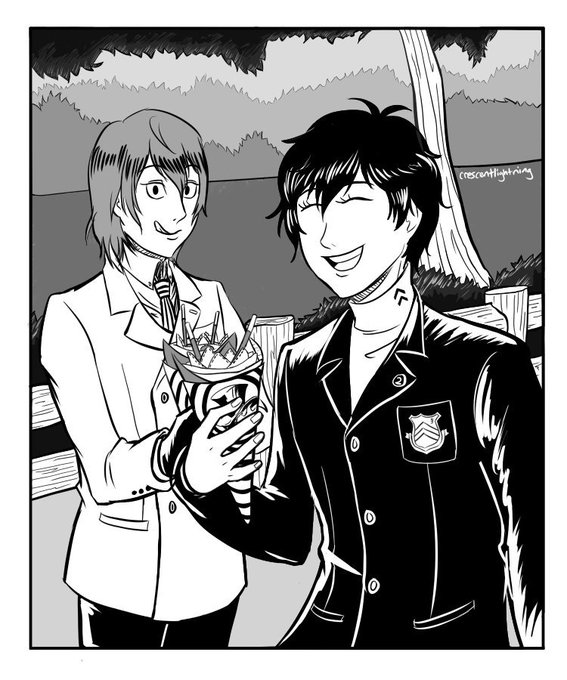 #ShuAke crepe date! Goro picks the food, Ren picks the place to stroll while they munch. Ren loves to take pics and send them to the group chat Ann and Haru: AWWW Futaba and Ryuji: You two are so sweet it's gross, but cute Makoto: Cute! Yusuke: CREPES #Persona5 #Inktober2019