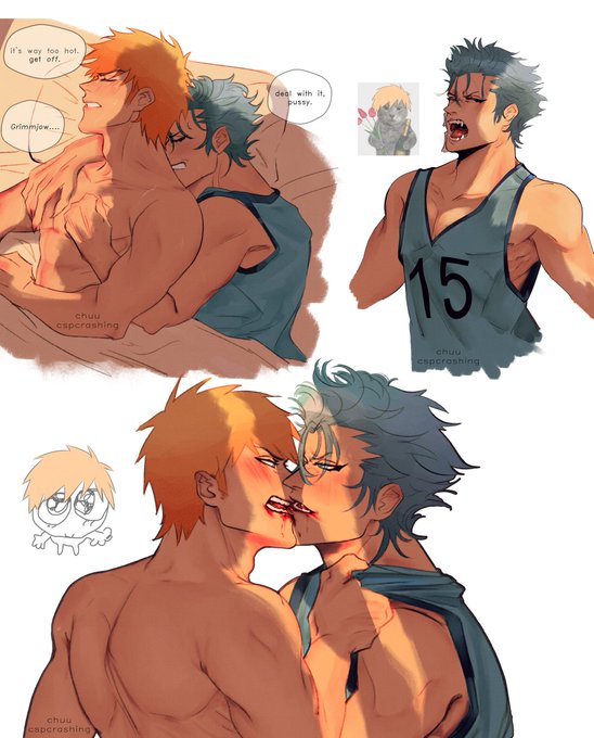 ☠️ : learning to use your teeth, kurosaki ? 🍓 : only because it shuts you up. ☠️ : if you just let me stick to your disgustingly sweaty body— 🍓 : my body is sweaty because you keep sticking yours to it ! ☠️ : can't handle the heat ? that's weak 🍓 : #grimmichi