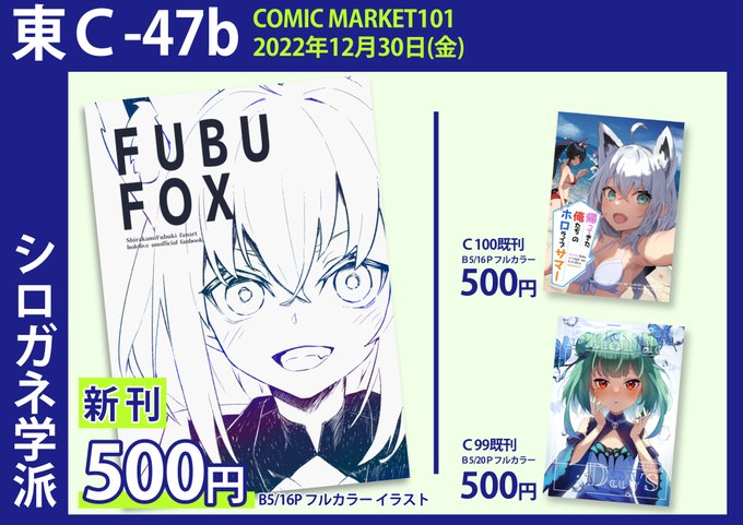 冬コミお品書きです。 シロガネ学派 12/30(金) 東1ホールC-47bでお待ちしております✨✨✨ 新刊は白上フブキさんのフルカラーイラスト本です。 当日は宜しくお願いします!! 🍈→melonbooks.co.jp/detail/detail.…