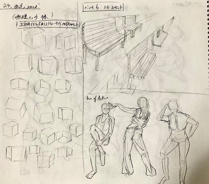 1 26 イラスト605日目 フォロワーさんの練習を参考にして、 無煙マッチ様の動画を参考に描いてみました。 人を箱で描く以前に、箱自体の練習大事だなぁと感じたので、ちょっと続けてみます 22/10/25 00:32