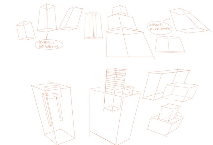 1 15 イラスト616日目 ようやくパースの勉強を始めました。 消失点を動かして描いてみたんですけど、 バラバラな配置をリアルに見せるにはどうしたらいいかが よくわからないので、写真をなぞるなどして学んでいきたいです 22/11/05 00:47