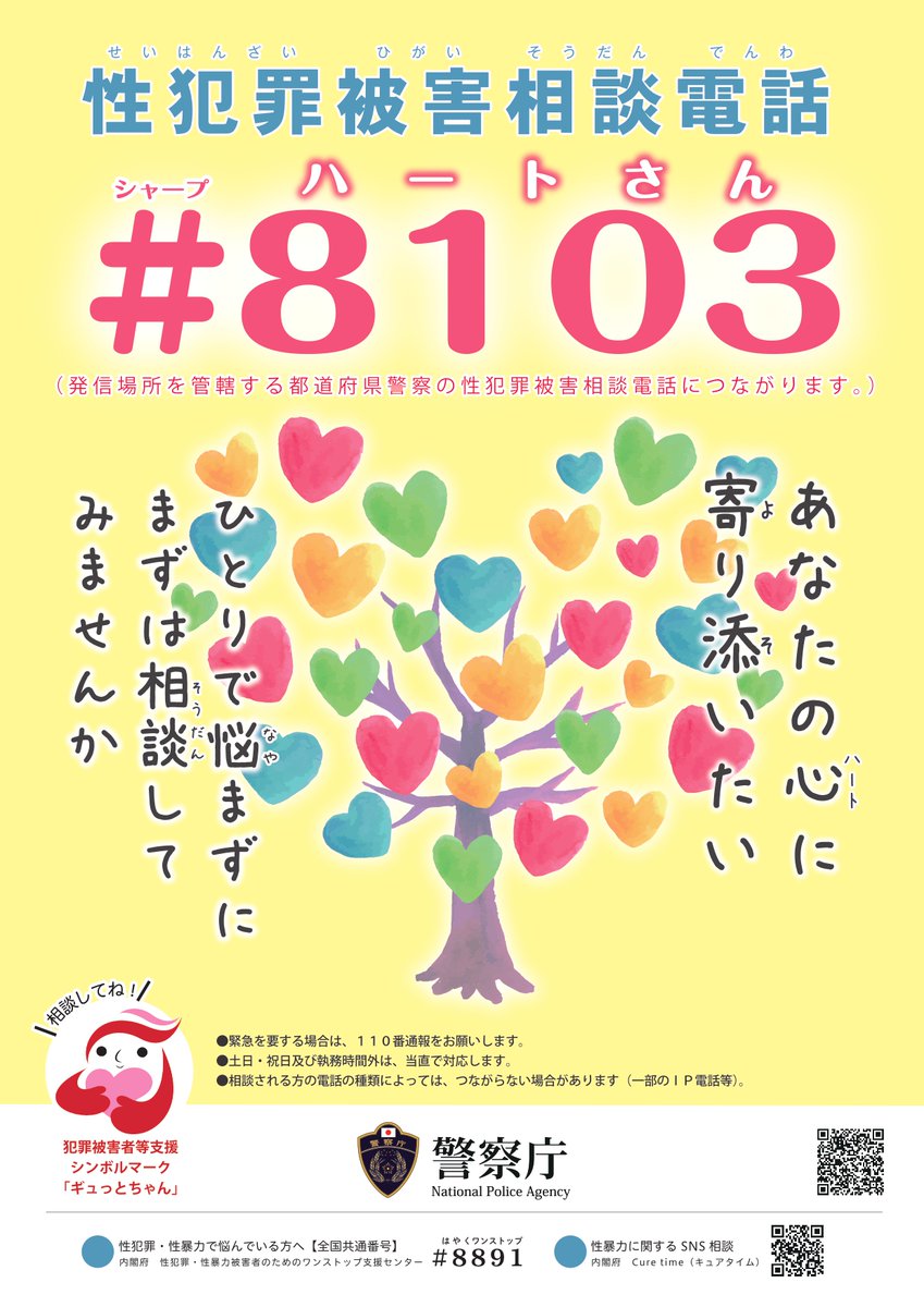 痴漢などの性犯罪に遭ってしまったときは、#8103(ハートさん)へダイヤルしてください。 最寄りの都道府県警察の性犯罪被害相談電話につながる全国共通の番号です。無料で24時間対応しています。