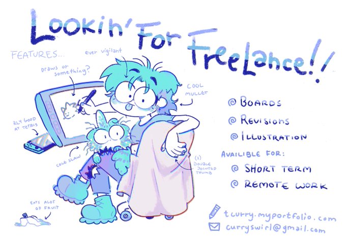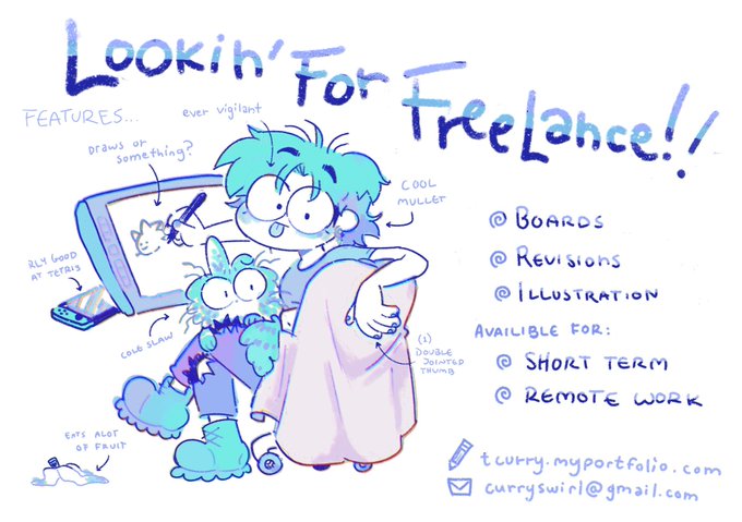 Waoho! I'm a on the hunt for Storyboard and Illustration freelance to supplement my income. I've got 2 whole dang years of animation boards experience and been freelancing illustration even longer. Portfolio below. twitter.com/curry_swirl/st…
