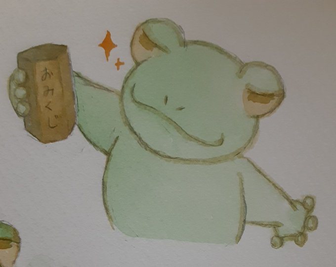 #アナログ絵 #水彩行進曲 #透明水彩 🐸「何回振ったろうか?🌟」 おみくじやる前って、何故か気合い入れてる👍🌟