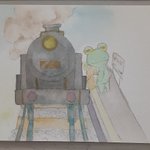 #水彩行進曲 #アナログ絵 『機関車で帰還するカエル』 ……最後がだじゃれでごめんなさい。 時間的にちょっと、早いですが… この一ヶ月、主催者様方をはじめ、 皆様のおかげでとても楽しく描けました☺️🎶 ありがとうございました🙇 🐸「…どーも(*^^*)ゞ💕」