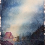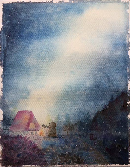 #透明水彩 #水彩イラスト #アナログ絵 で~け~たっ‼️✨️ ソロキャンプベアー🐻🎶 シルエットだけを考えていたのに つい楽しくて、描き描き塗り塗り… 不思議な感じになりましたとさ👍