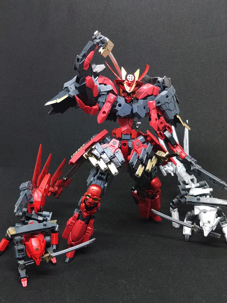 スピナティオ・オウガ : ONI SIMAZU 【マクシオン戦国絵巻所属】 地球極東区の伝承“もののふ”島津義弘の顕現を目的に開発された機体。 紅白一対の狐型随伴機「INARI」と共に戦場を駆ける。過熱時には胸部装甲を解放して排熱することで苛烈な猛攻を維持できる。 #30MM荒野戦 #30MMマクシオン軍