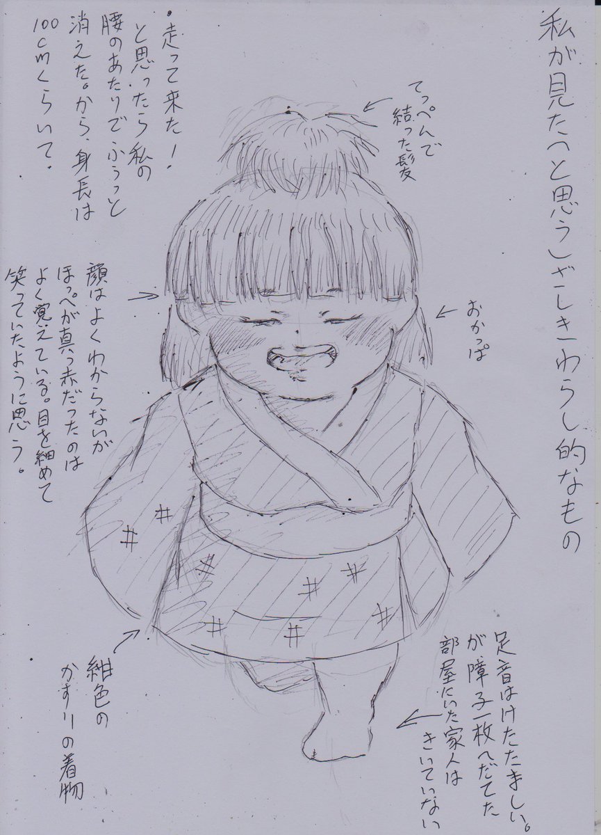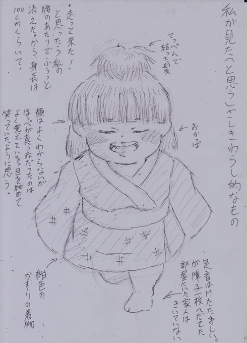 @shimatakehito ふと思い出して、絵に描いてみました。 白昼夢だったかも知れないし「確かに見た!」と言うつもりは無いのですが、記憶はやたらはっきりした物で、今でも鮮明に思い出せます。 叔父の家でしたが、血筋は旧家でも建物自体は新築の家だったので、座敷童子かどうかは疑問に残ります。