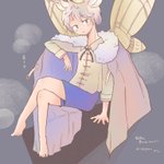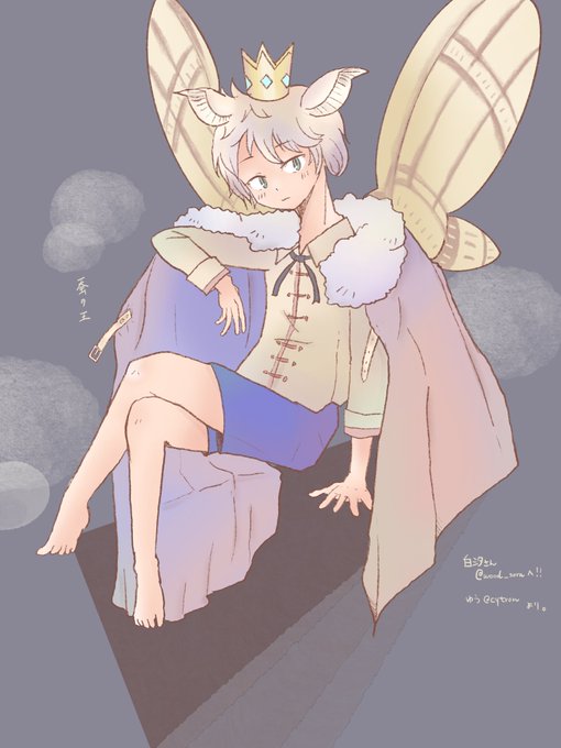 白汐さん @wood_sora の蚕の王描かせていただきました!男の子と王冠、マントめっちゃ好きな組み合わせなので、楽しく描かせてもらいました。。足長い!綺麗!と思ったので、王さまにはリラックスしていただいて…素足です😳じっくり見れば見るほど素敵な造形でより大好きになりました!