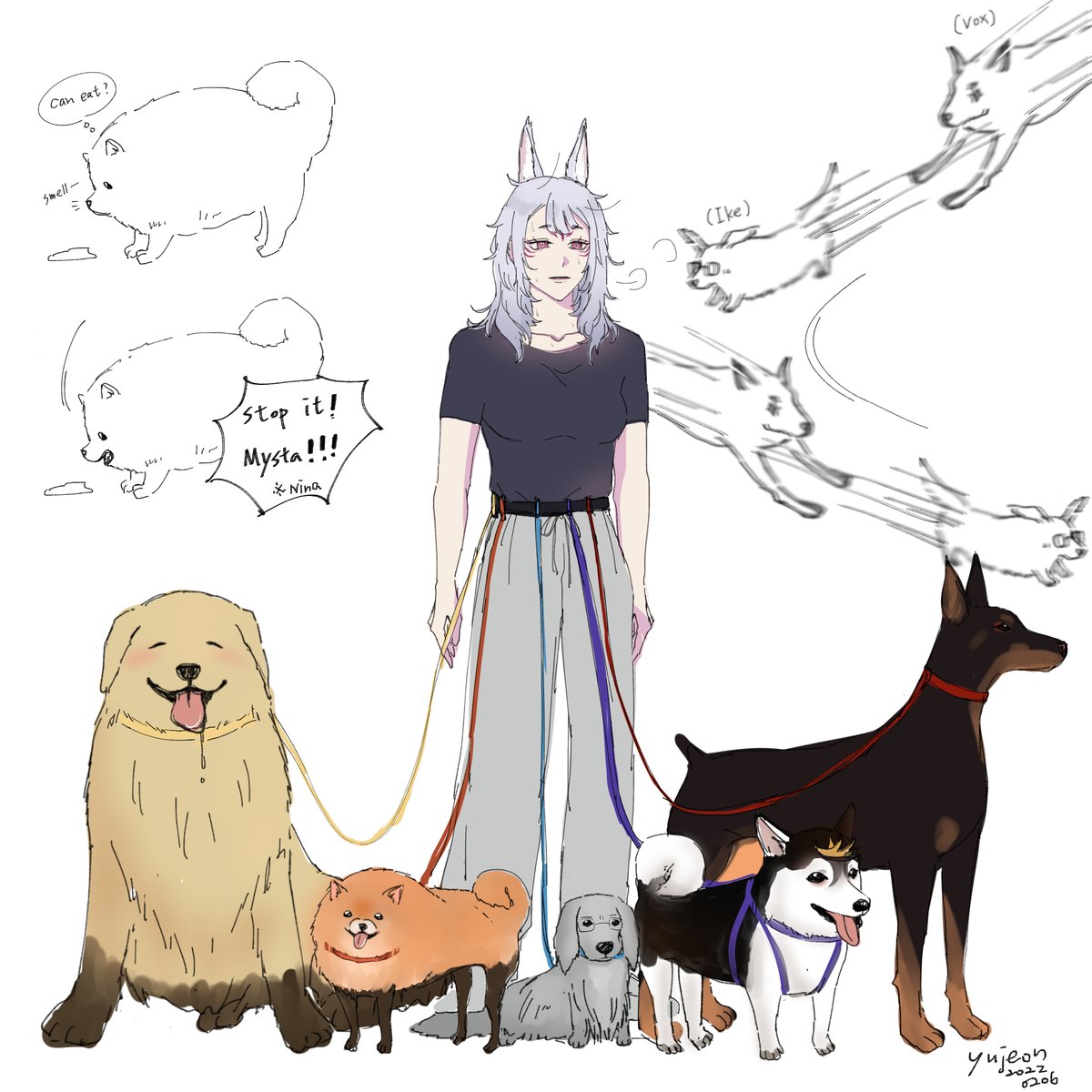 Nina遛狗狗 🐶 Luca-Golden Retriever Mysta-Pomeranian Ike-Dachshund Shu-Siberian Husky/Corgi Vox-Doberman Pinscher #DrawKosaka #MystArt #drawluca #Akurylic #Ikenography #YaminoArt