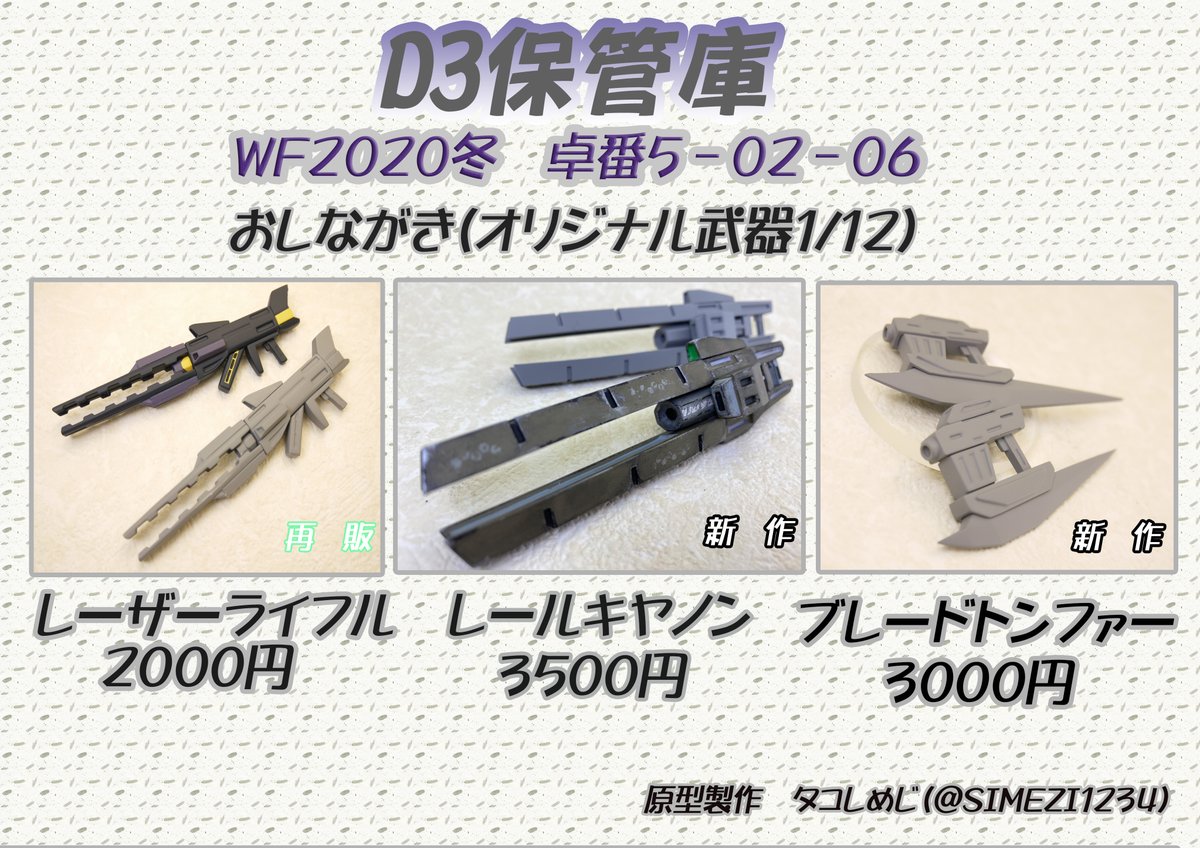 20 31 WF冬〜タコしめじさんの1/12オリジナル武器の新作です! 1/12レールキャノン 3500円 1/12ブレードトンファー(2丁入り) 3000円 #wf2020w #メガミデバイス 20/01/26 18:45
