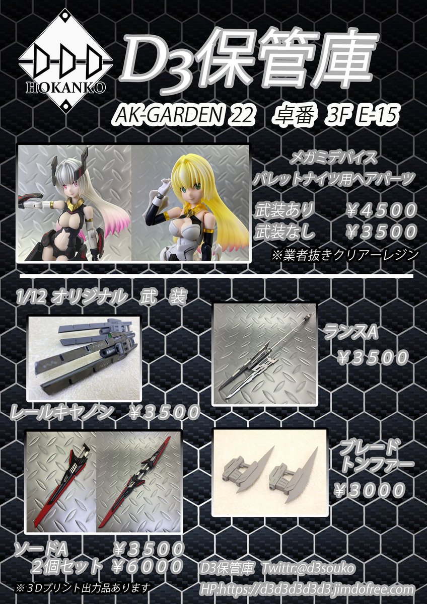 45 73 (イベント告知) AKガーデン22参加いたします! 卓番 3F E15 今回はメガミ系のパーツメインです。 今回も先着限定でお買い上げの方に髪パーツをプレゼントいたします! よろしくお願いします! #メガミデバイス #AKG22 22/11/08 18:08