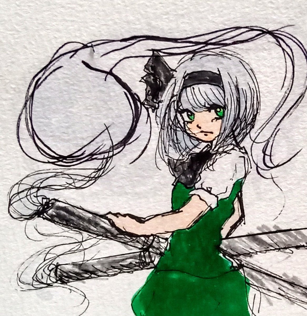 魂魄妖夢ちゃん描きました!半霊の部分は筆ペンで描いてます。 #東方イラスト #東方Project #絵描きさんと繋がりたい #illustration #春の創作クラスタフォロー祭り #イラスト