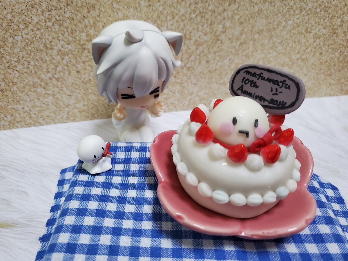 まふまふさん10周年おめでとうございます。 活動10周年を記念して樹脂粘土でまふてるケーキを作りました。 悲しい世界があってもいいこと、新しい世界をまふまふさんの曲と詞が教えてくれました。 感謝しかありません。 これからもまふまふさんについていきます。 #まふまふさん10周年 #まふあーと