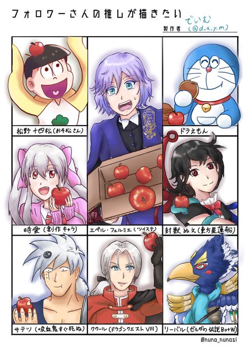 #フォロワーさんの推しが描きたい 大変お待たせいたしました!! 枠が余ったので私の推しをセンターに置いた結果、🍎秋の林檎大感謝祭🍎になりました(゚∀゚) 見事に全然違うタイプのキャラクターたちが揃ったので、自分にとっても良い絵の修行になりました!