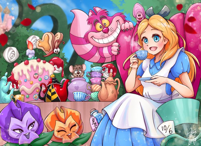 『アリスのティーパーティー』 リクエストいただいていたお茶会してるアリスのイラスト描けました🫖 #ふしぎの国のアリス #アリス #AliceinWonderland #Alice #チェシャ猫 #ヤングオイスター