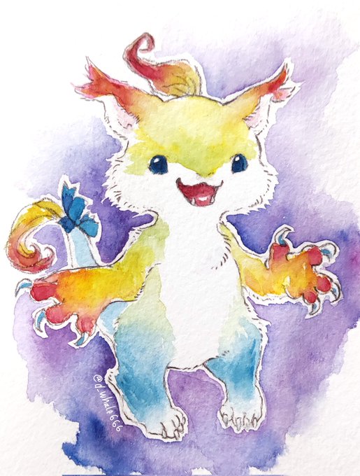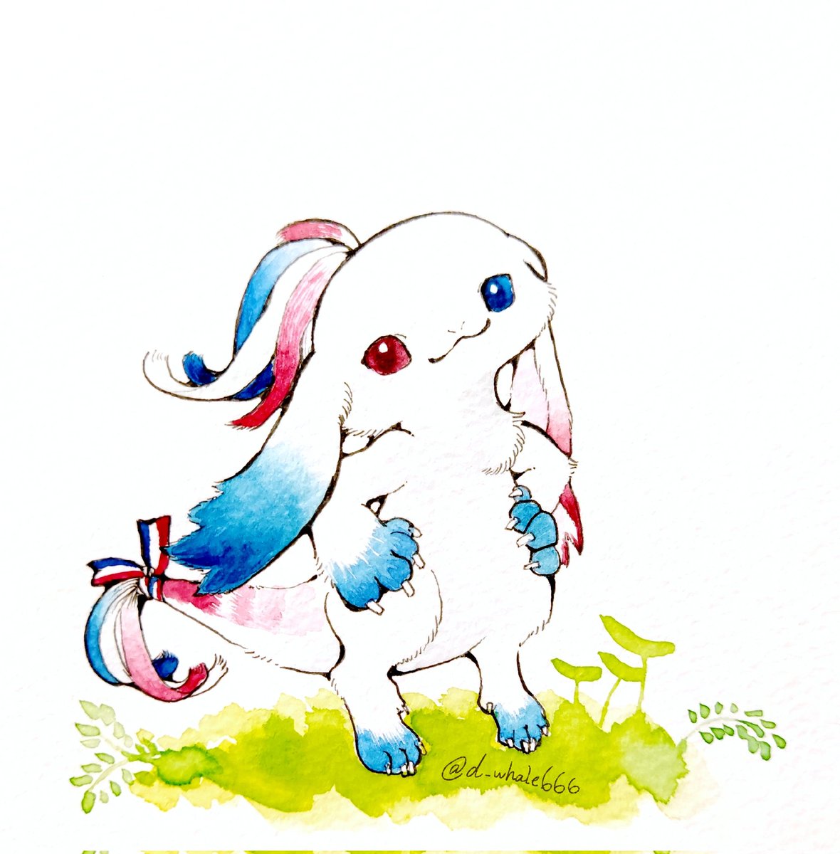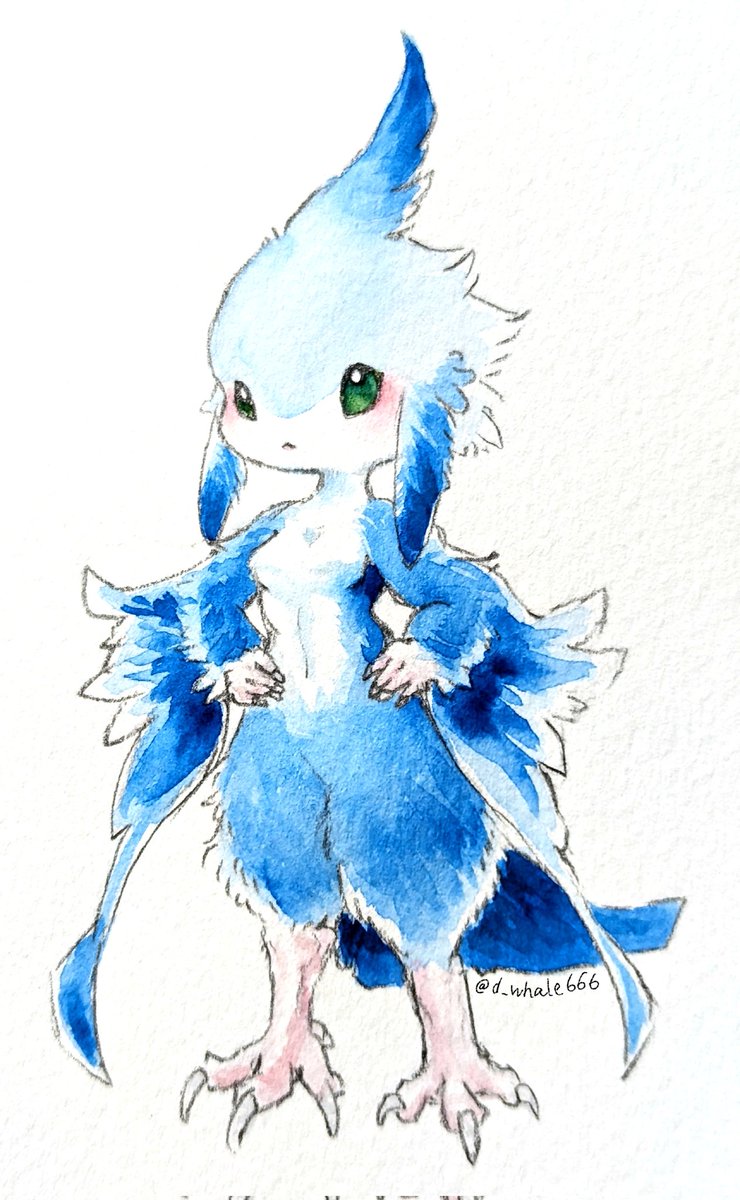 #人外版深夜の真剣お絵描き60分一本勝負 「アナタが考えるトリコロールカラーを使った人外」 💙🤍❤️ ちょっと小柄なすだまの子、勝ち気なところがある。