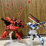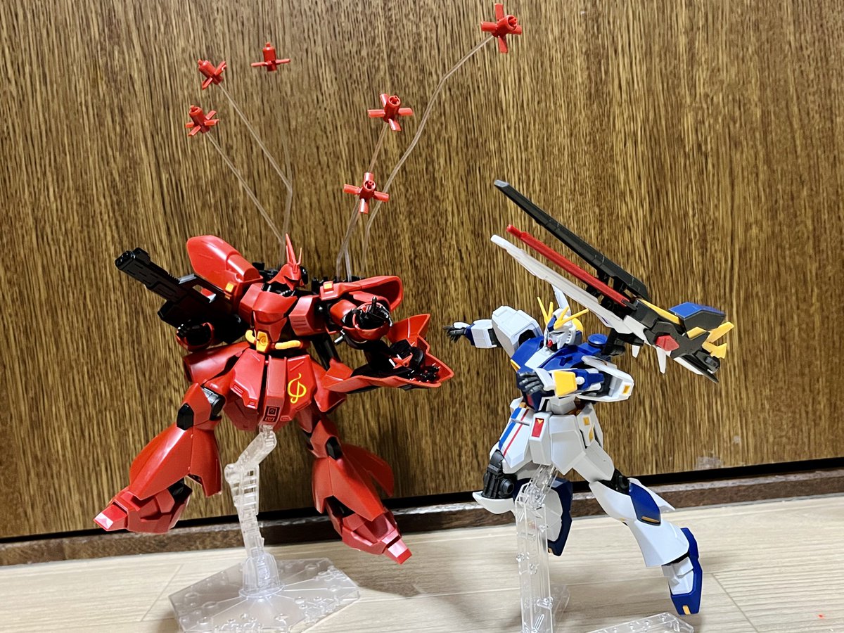 HGUCサザビーのファンネルのいい感じの飾り方をネットで見つけたので、先日組んだEG福岡νガンダムと並べて対決… そしたら丁度いいタグがあるから便乗! #TLに深刻なνガンダム不足 #ガンプラ