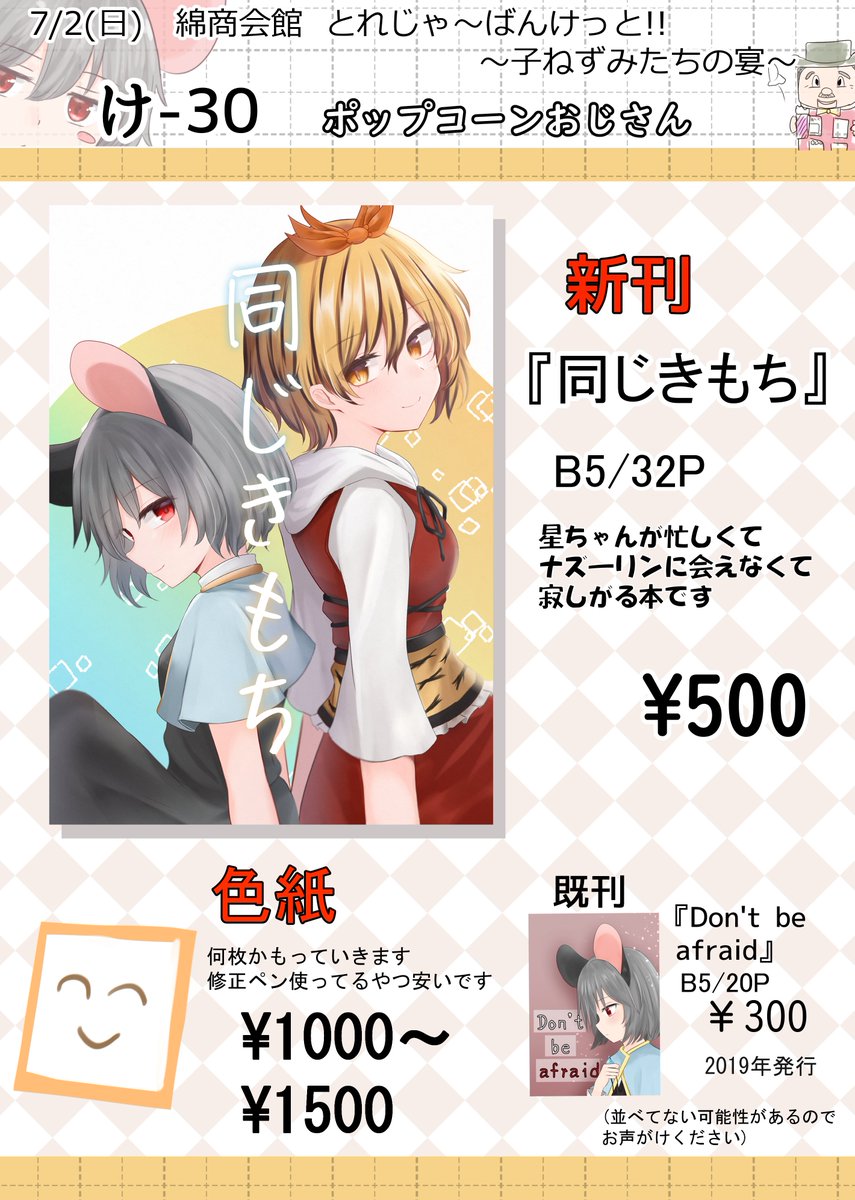 57 141 【とれけっと新刊】 7/2に開催されるナズーリンオンリーで頒布予定の『同じきもち』のサンプルです! B5/32P/500円 星ちゃんがナズーリンに会えなくて寂しがる本です! 23/06/30 14:43