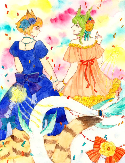 【PFSOZ】彩りおめかし聖夏祭 | ダリア💎🏜 pixiv.net/artworks/10352… 女子(❓)会お祭りデート(意訳)🌠ハチャメチャに満喫するミケランとクランツ嬢です💖💠🐈🦅💠💖🎉✨✨✨✨💝 #PFSOZ #pixivファンタジアSOZ