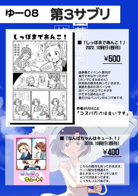 39 92 おしながき追加です! 8Pのコピー本が出ます! 頒布価格100円にて ゆ-08でお待ちしております! twitter.com/dai3aji/status… 23/03/12 09:39