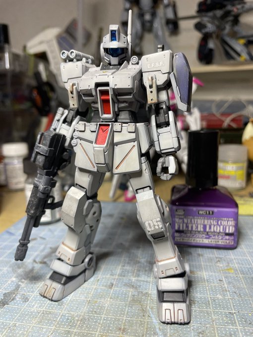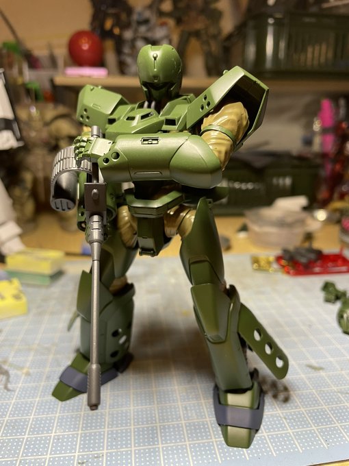 #お昼休みに一枚だけ模型写真を貼ろう #ガンプラの画像を貼るとRTされると聞いて 今日はここ最近登場しまくりのジムスパルタン。 寒冷地仕様設定で制作中💨 ウェザリング終了かな❓ε-(´∀`; ) 後ろ姿のこのワチャワチャ感が好きなのよ☺️