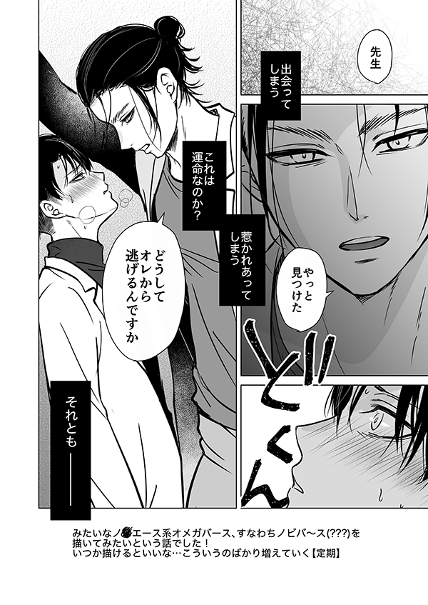 エレリ ※オメガバ〜ス 6月25日のイベントで無料配布したノ♂エースネタのエレリです。運命のショタに出会ってしまうりばい先生っていいよねヘヘ…という気持ちで描きました!いつかちゃんと描いてみたいナ-