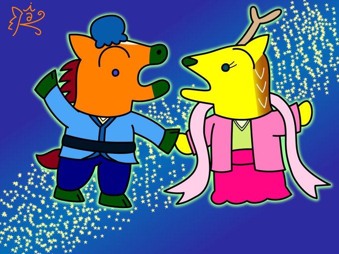 今日は #七夕 🎋 ダイちゃん彦星とキイちゃん織姫が、みんなの願いを叶えに行きます🌟 🦌「七夕は、本当は芸事の上達をお願いするものだけど」 🐴「芸事じゃなくても、お願いはお願いだよね!」 🐴🦌「どんなお願いも、お任せあれ!」 #イラスト #illustration #オリジナルキャラクター