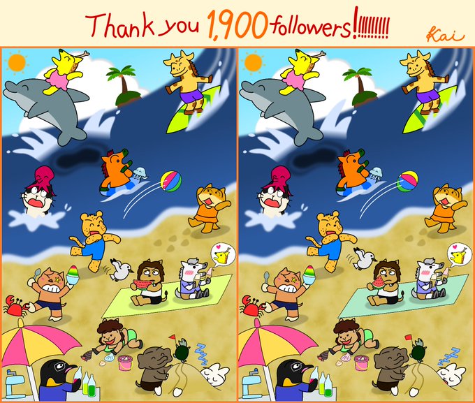 ㊗1,900フォロワーありがとうございます🎉 いつもいいねやRT、リプをくださる皆様に感謝です💕 今日は #海の日 、みんなはビーチへやってきました🌊⛱ 久々に絵違い探しを作りました✨ 2枚の絵には、違うところが全部で19個🔍 頑張って探してみてくださいね✌ #illustration #イラスト