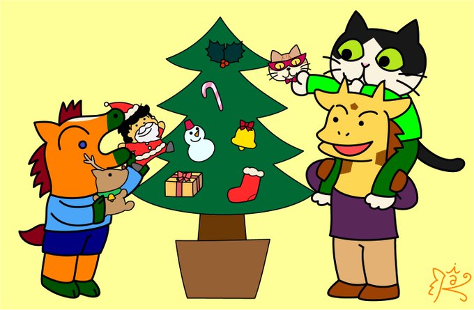 ダイちゃんたちがツリーを飾るよ🎄 🐴「今年もサンタさんとトナカイさん、来るかなぁ」 🐈⬛「"ねこちゃんかめん"の飾りも作ったよ~」 🦒(本当はクリスマスっぽいものを飾ってほしいけど) #絵描きさんと繋がりたい #イラスト #イラスト好きさんと繋がりたい #オリジナルキャラクター #illustration