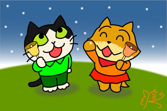 ハンドベルを演奏していたら、雪が降ってきました❄ なかなか降らなかった雪に舞い上がるクロちゃんとイネちゃん🦊🐈⬛🎶 ちなみにこちらは現在雨が降っております☔ 天気が悪いので、足元お気を付けてお過ごしください😌 #イラスト #illustration #オリジナルキャラクター